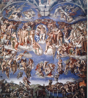 최후의 심판은 미켈란젤로에 의한 '신곡'이라 할 수 있습니다. 단테가 그의 생에 중 만나게 된 사람들을 평가하여 지옥, 연옥, 천국에 그 위츠를 매긴 것처럼 미켈란젤로는 시각적 표현에 의하여 심판자 그리스도를 중심으로 천상의 세계에서 지옥의 세계로 차례를 매겨 나갔습니다.