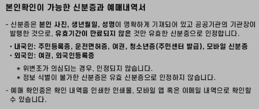 - 티켓부스에서 예매자 본인 신분증과 예매내역서를 제출 후 수령 가능