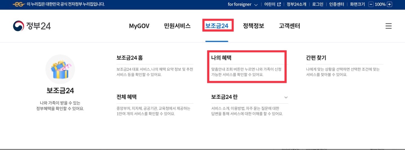 정부 24에 홈페이지 접속 - 보조금 24 카테고리 선택 -나의 혜택 선택 후 로그인하여 나의 조건에 맞는 여러 가지 혜택을 확인할 수 있습니다.