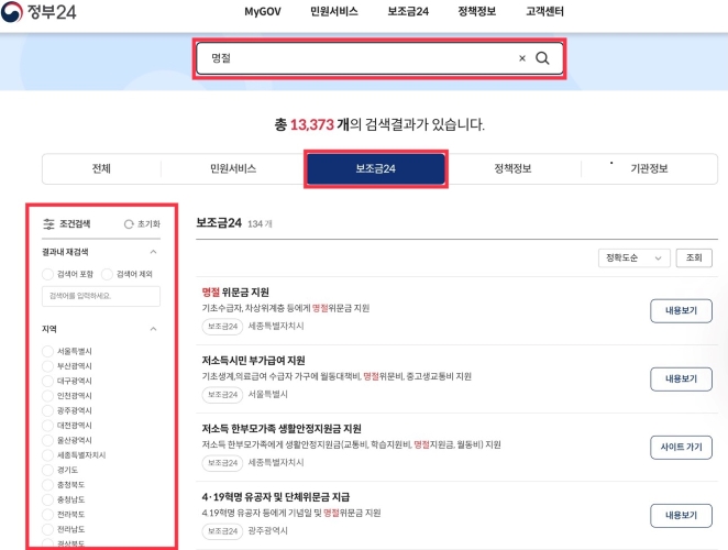정부 24 홈페이지에 접속 후 '명절'을 검색한 후 보조금 24 카테고리와 좌측 아래의 조건검색에서 지역을 누르시면 지역별 지원내용을 확인하실 수 있습니다.